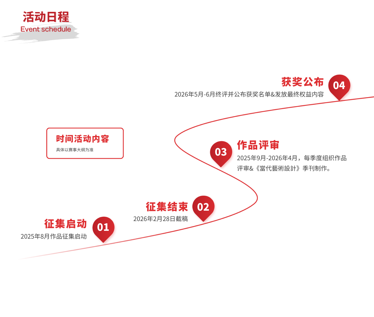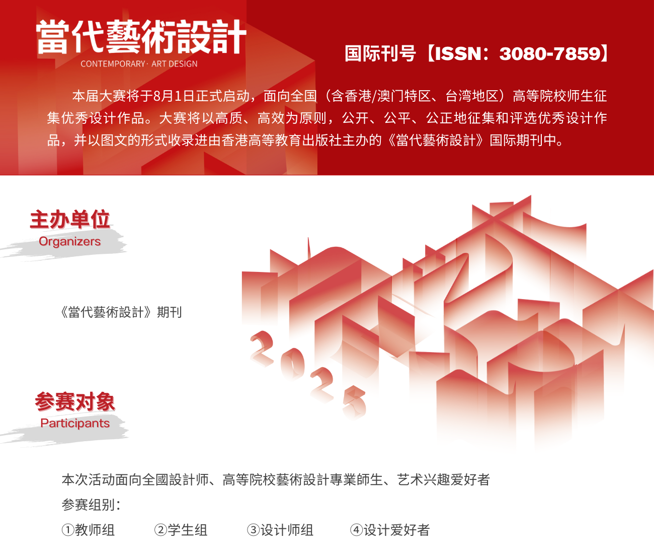 本届大赛将于8月1日正式启动,面向全国(含香港/澳门特区、台湾地区)高等院校师生征集优秀设计作品。大赛将以高质、高效为原则,公开、公平、公正地征集和评选优秀设计作品,并以图文的形式收录进由香港高等教育出版社主办的《當代藝術設計》(ISSN:3080-7859)国际期刊中。